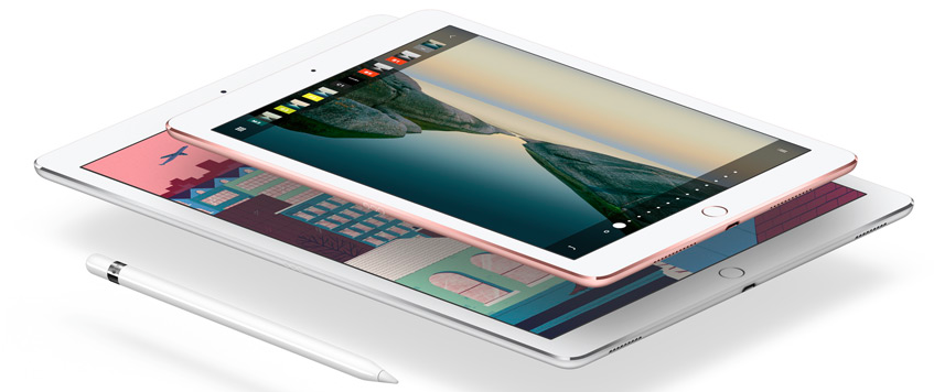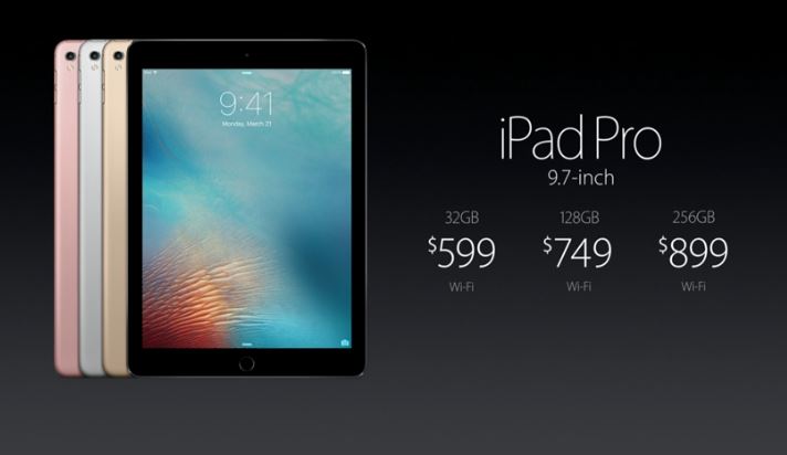L’iPad Pro de 9,7 pouces est disponible en métallisée argent, gris sidéral, or et désormais en or rose à partir de 695 euros pour le modèle Wi-Fi 32 Go et de 845 euros pour le modèle Wi-Fi + 4G LTE 32 Go.