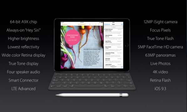 Tournant sous iOS 9.3, cette nouvelle tablette et plus puissante que l’iPad Air 2 et à pour caractéristiques :