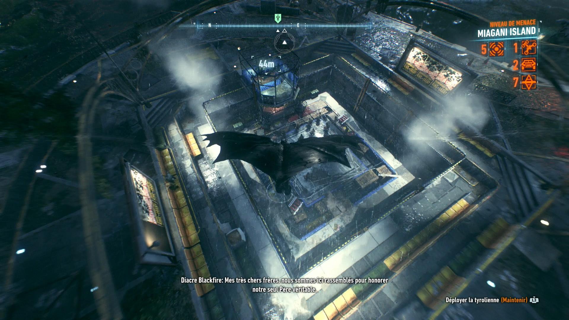 On pourra néanmoins compter sur l’Epouvantail pour apporter ce petit plus scénaristiques même si ici, c’est plutôt raté vu que sa présence reste anecdotique alors qu’à l’inverse son plan diabolique est mis en avant. On peut dire la même chose du Joker qui est mort à la fin d’Arkham City, mais qui est plus présent dans ce Knight. Comment ? Par le biais d’hallucinations que possède Batman, et que vous aurez à souffrir durant ces vingt heures de jeu. On peut dire que l’histoire d’Arkham Knight, est bonne tout en étant décevante, que se ce soit pour les joueurs lambda que les fans, surtout lorsqu’on le sait l’importance de la révélation finale sur la vie de Bruce Wayne.