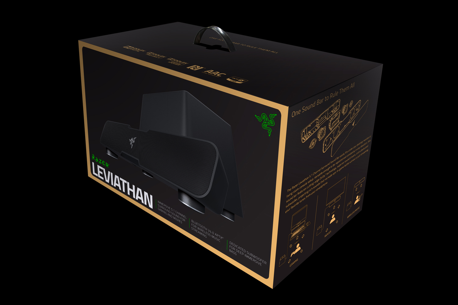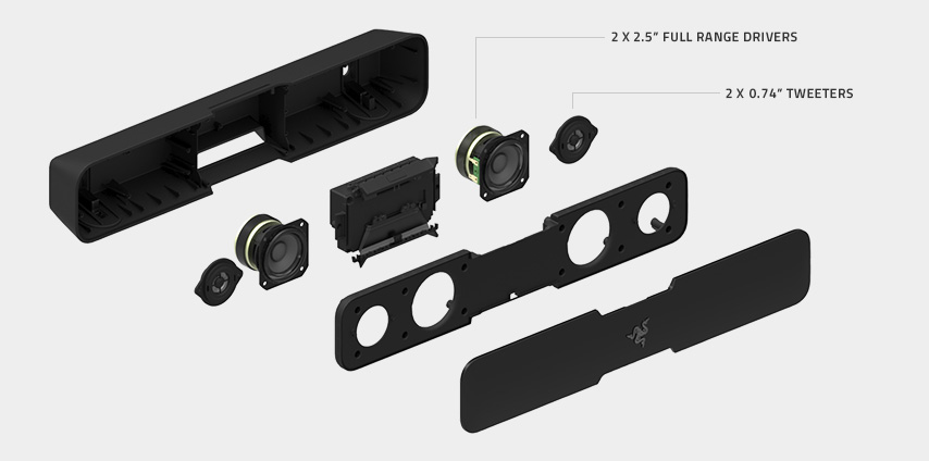 Le Razer Leviathan est donc, un barre de son 5.1 Dolby disposant de 4 haut-parleurs avec deux haut-parleurs pleine gamme de 63.5 mm et deux autres tweeters de 19 mm. De plus, que le Razer Leviathan soit en mode stéréo ou en multi-canal, le son sera converti en son virtuel surround grâce à la technologie Dolby Digital.