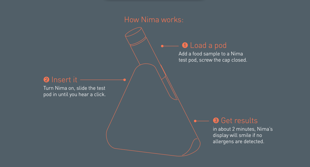 Comment il fonctionne ? Rien de plus simple, il suffit de glisser un échantillon du plat et le Nami détectera toute trace de gluten au-dessus des normes internationales. Le résultat, apparaitra, deux minutes plus tard sous forme d’émoticône sur le petit écran du Nima.