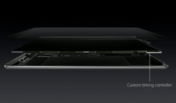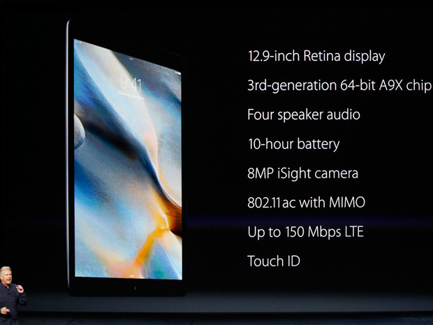 Doté d’un écran de 12,9 pouces de 56 millions de pixels, plus que pour le MacBook Pro. Cet iPad Pro possède un Appareil Photo Numérique de 8 mégapixels et est doté d’un processeur A9X, 1,8 fois plus puissant que l’iPad Air, selon Tim Cook.