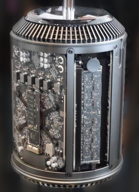 La machine est composée de base d’un Intel Xeon E5 quad-core à 3,7 GHz, 12 Go de DDR3 ECC à 1866 MHz, de deux GPU AMD Fire Pro avec 2 Go de DGGDR5 et 256 Go de stockage sur un SSD interfacé en PCIe.