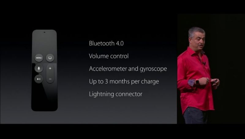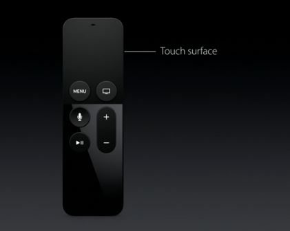 Il s’agit de la nouvelle télécommande. Plus grande que la précédente, elle est désormais équipée d’une surface tactile, mais également d’un gyroscope, en plus des boutons classiques et d’un micro pour parler à Siri. On notera également la possibilité de commencer un jeu, ou un film sur son iPhone et le terminer sur sa TV via l’Apple TV ou inversement.