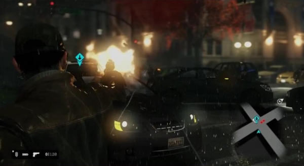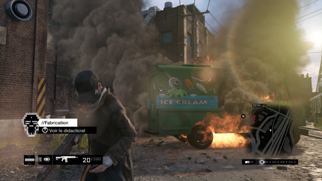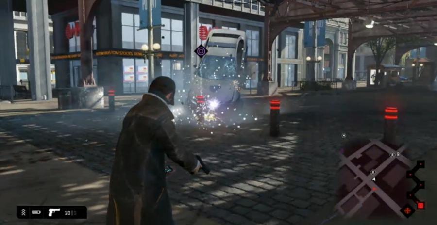 Aiden dispose donc d’un tas d’outils de piratage qui peuvent être améliorer et utiliser dans Chicago, mais il ne possède pas seulement d’outils de piratage puisqu’il possède une palette d’armes classiques. Vous pourrez donc créer des diversions, ou bien foncer dans le tas durant vos missions. Par exemple, grâce au scan ctOS vous aurez la possibilité de connaître l’emplacement de tous les ennemis d’un endroit ou bien d’utiliser le Blackout, qui neutralisera tous les éléments électroniques à proximité et vous permettra de fuir en profitant du chaos et de l’absence de lumière qui découlent de la perte de signaux électriques. Néanmoins, bien qu’on peut se passer du Blackout grâce aux nombreux éléments qui peuvent être piratés, ces dernières sont très arcades et demanderont du temps bien les contrôler. Cependant on note un gros point noir, les collisions. Celles-ci sont imprévisibles mais ne gâchent au jeu.