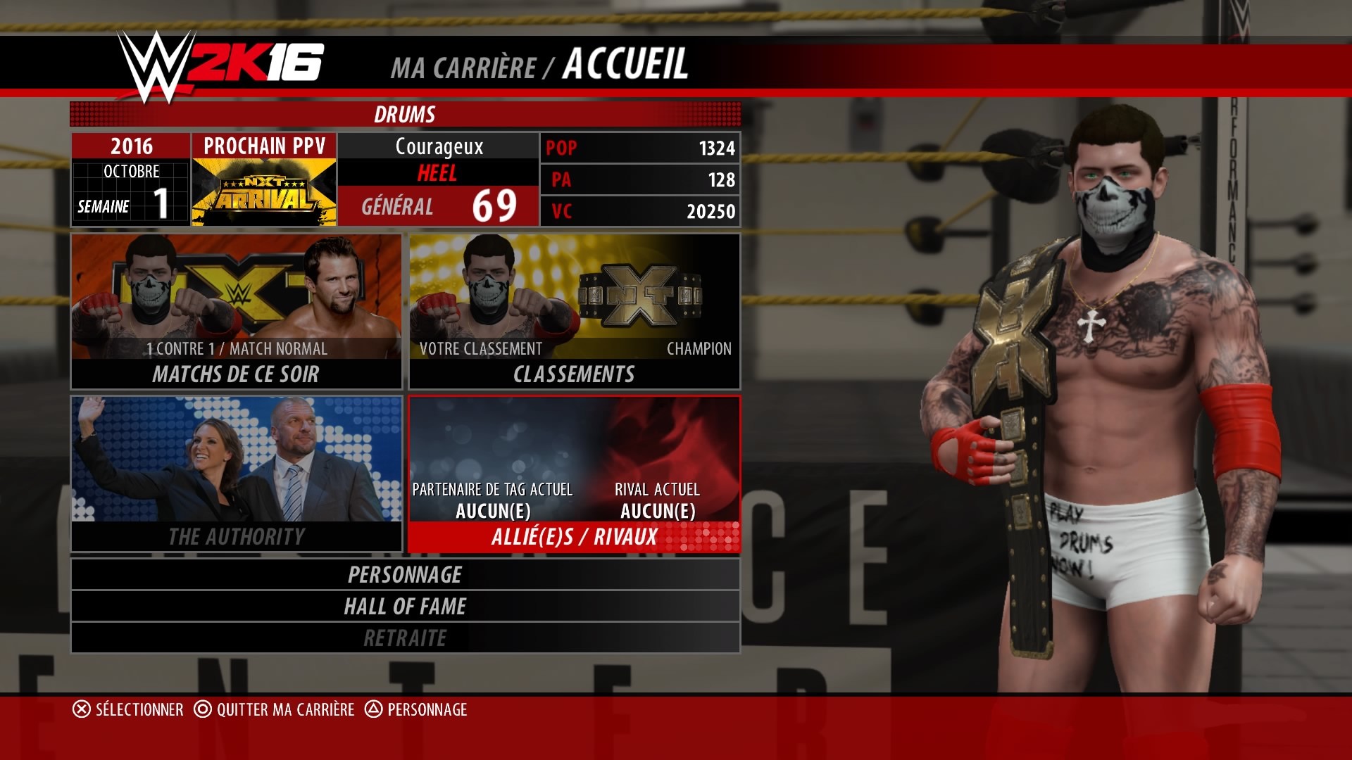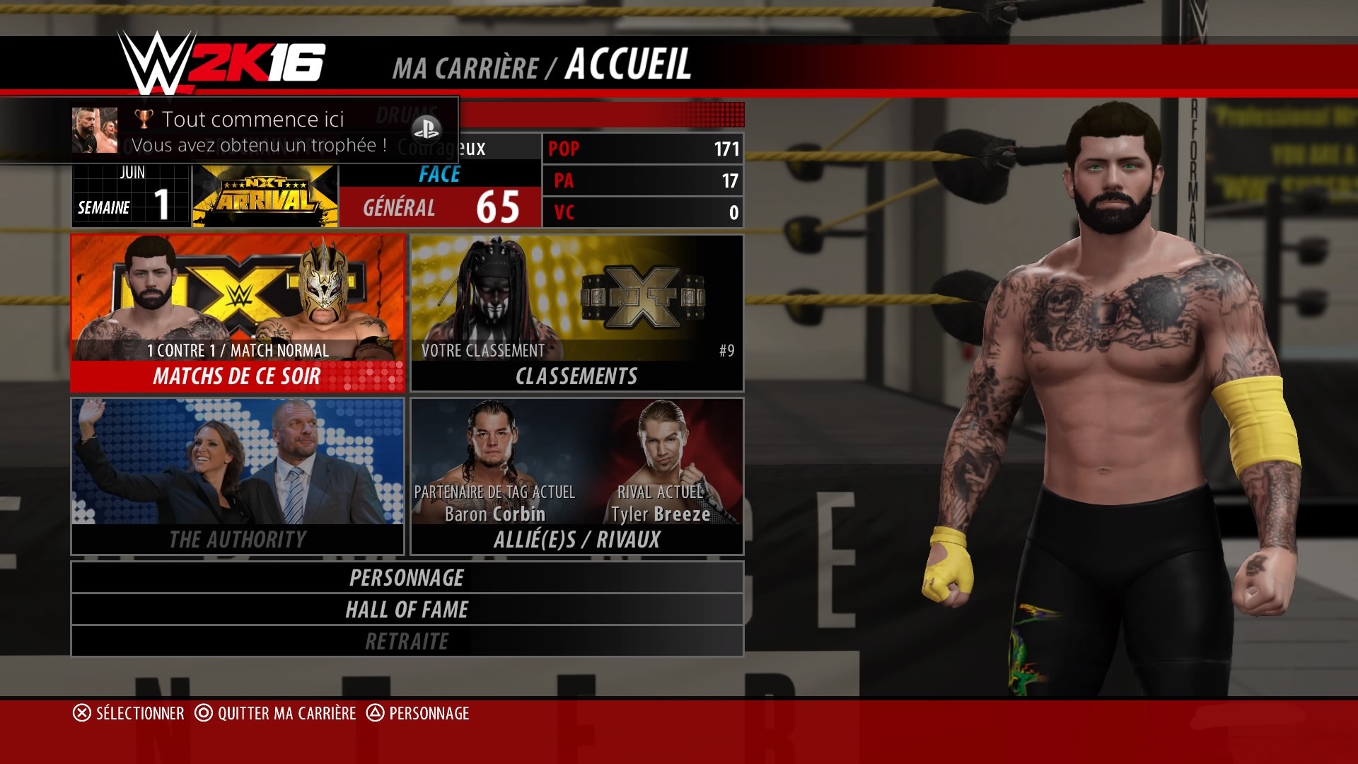 Après quelques bases appris au Perfomance Center et deux matchs encadrés par un coach, enfin nous voilà à NXT. Nous sommes pour nos débuts considérés comme FACE (gentil) mais après notre premier match votre première interview peut vous faire rapidement nous devenir HEEL (méchant). Dés vos débuts, vous pouvez choisir votre look, votre liste de coup et votre entré. Mais vous êtes nouveau, il vous faudra acquérir l’expérience pour acheter de nouvelles aptitudes (Plongeon extérieur , Second Finisher etc ….). Lorsque que vous créez votre superstar, choisissez bien votre taille puisqu’elle déterminera votre style de jeu par la suite. Comme dans tout sport, il y aura forcément quelqu’un qui ne vous aimera pas, et ici c’est Tyler Breeze qui deviendra votre premier rival. Au contraire, vous pouvez également vous trouvez un partenaire de Tag qui deviendra donc votre alliée. A chaque match terminé, vous gagnerez des points d’aptitudes qui augmenteront vos chances de victoires et votre promotion au Hall of Fame ! Gérer donc votre superstar comme bon vous semble pour peut devenir un jour WWE Champion. Mais avant cela vous devez être promu à Raw ou à Smacdown, pour cela il vous faudra devenir NXT Champion . Combattez et remportez des matchs pour devenir #1 Aspirant au titre . Puis, pour avoir cette opportunité de titre, soyez en rivalité avec le champion.