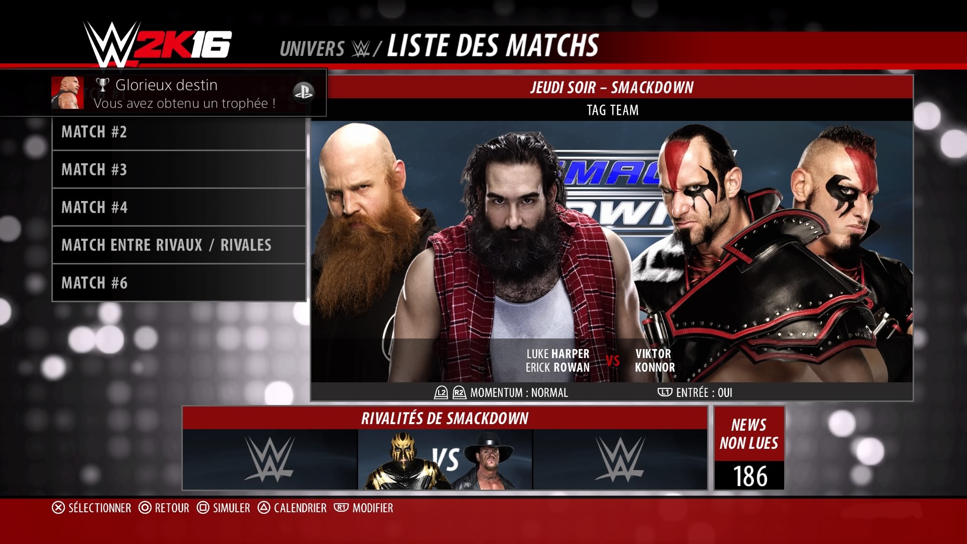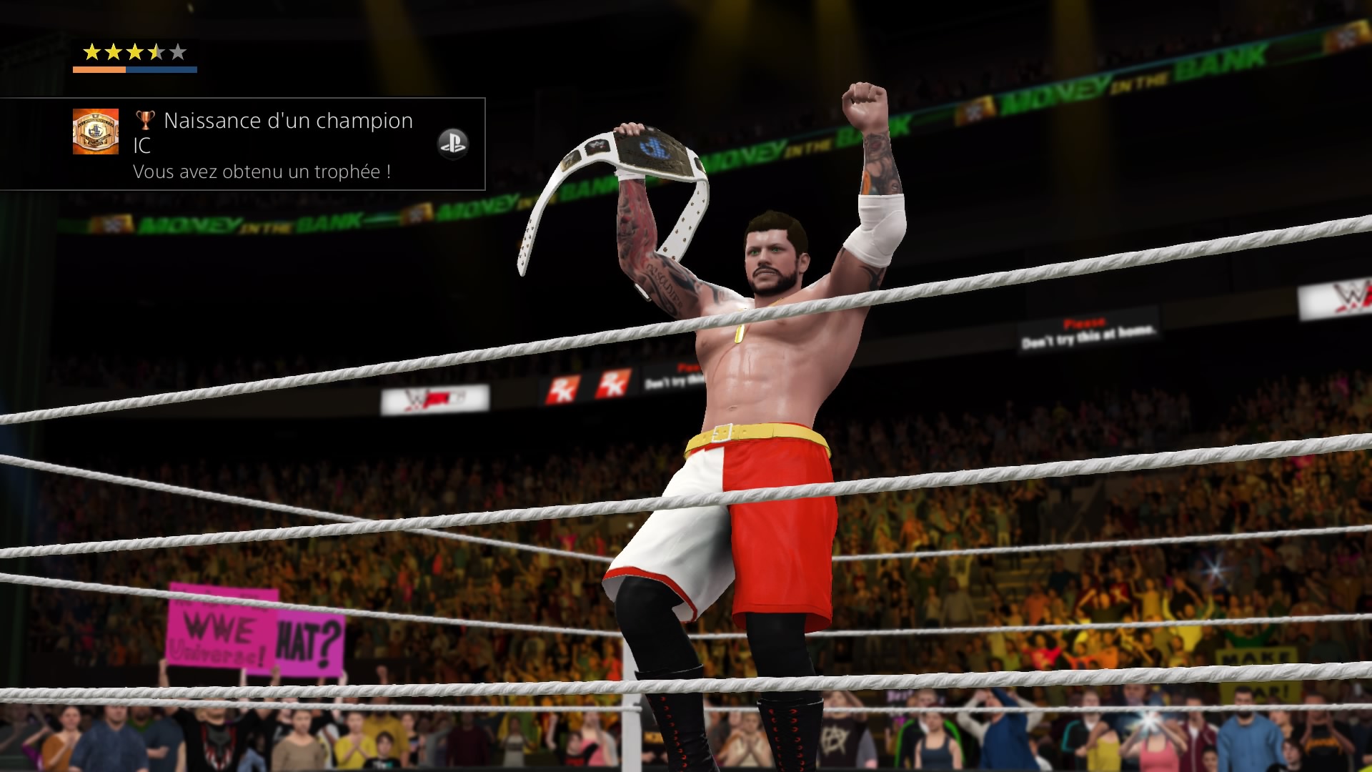 WWE 2K16_11Le mode univers est sûrement le mode le plus fun et avec la plus longue durée de vie du jeu . En effet, vous pouvez jouer tout les matchs en leur intégralités, créer des rivalités et des équipes en tout genre. Créez votre propre show et même gérer la draft ( c’est à dire qui va dans quel show et pour quel raison ). Vous pouvez même modifiez les matchs déjà présent pour y rajoutez une règle, une superstar, que vous incarnez à chaque match comme dans le mode carrière, mais ici, vous pourrez augmenter les capacités des superstars comme bon vous semble. Cependant deux grands axes existent dans ce mode univers, un mode univers fidèle à la réalité et un mode univers complètement fou, je m’explique. Changez les tenues des superstars entre elles, mettre Baron Corbin comme WWE Champion, créez une équipe entre John Cena et The Ascension . Une rivalité Goldust vs Undertaker à Wrestlemania ? Possible comme en témoigne la photo juste en haut. Un mode très très fun mais qui peut vite lassez. De l’autre, vous avez le mode univers classique, des rivalités cohérentes, des champions actuels ou bien des anciens champions . Des victoires logiques, des attaques stratégiques et des pay perviews endiablés. Pour ma part, c’est bien le dernier axe cités qui me plaît car certes, il y a moins de possibilité, mais vous pouvez restez fidèle à la réalité, tout en prenant extrêmement de plaisir . On note malheureusement, que les possesseurs de consoles anciennes génération n’auront pas le droit au mode ma carrière, et que donc leur mode univers deviendra un mode carrière en quelque sorte. Simulez tout les matchs sauf ceux de votre superstar, créez des rivalités qui vous arrangent et vous organisez vos propres matchs pour pouvoir devenir champion.