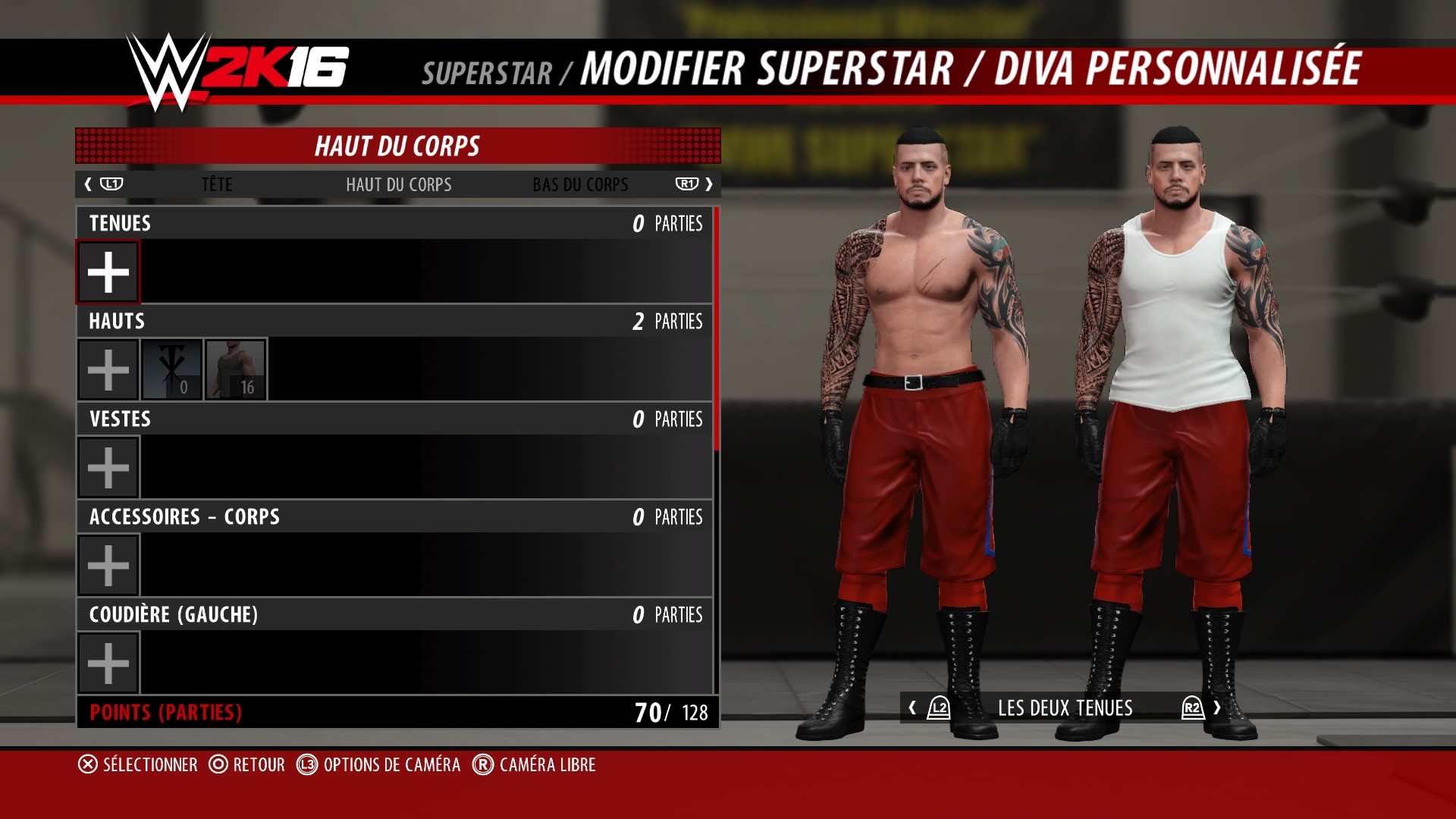 WWE 2K16_15Tandis que le mode carrière est le mode qui sera sans aucun doute le premier mode, jouer par vous, la partie création sera celle ou vous passerez le plus temps. Ainsi, combattant, arène, show, vêtement, tatouages ou encore ceintures… tout est personnalisables. Nous allons ici nous consacrer exclusivement dans la création des catcheurs, vous aurez d’énormes possibilités. Musclé, trapu, maigre, baraqué, rocker, petit ou grand, chauve ou cheveux long, barbu ou pas, vous pourrez tout faire. Créer un catcheur sera donc un jeu d’enfant, comme dans NBA 2K16. des motifs faciales et maquillage sont aussi à dispositions. Pour ma part j’ai opté, pour une superstar de 1m89 assez musclé. Pour ce qui est de la tenue donc, elle également personnalisable entièrement, avec comme nouveauté et non des moindres l’importation des logos pour offrir un côté extrêmement réaliste a votre superstar. Lettrage, logos même les tatouages peuvent être directement importés grâce au site de création WWE 2K16. Comme chaque année, une tenue d’entrée et une tenue de ring sont disponibles. En parlant d’entrée, on remarque que malheureusement on ne peut plus importer des musiques et sa vidéo Titantron pour sa superstar. Ce n’est qu’un petit vu la diversité de personnalisations que nous offre le jeu.